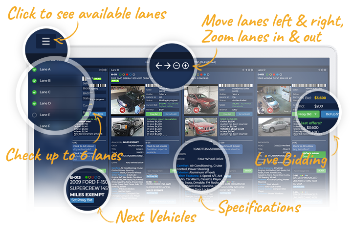Check up to 6 lanes and have them all displayed on a single screen for multilane participation, rapid bidding, and live streaming. Click control buttons to manipulate lanes at your discretion.